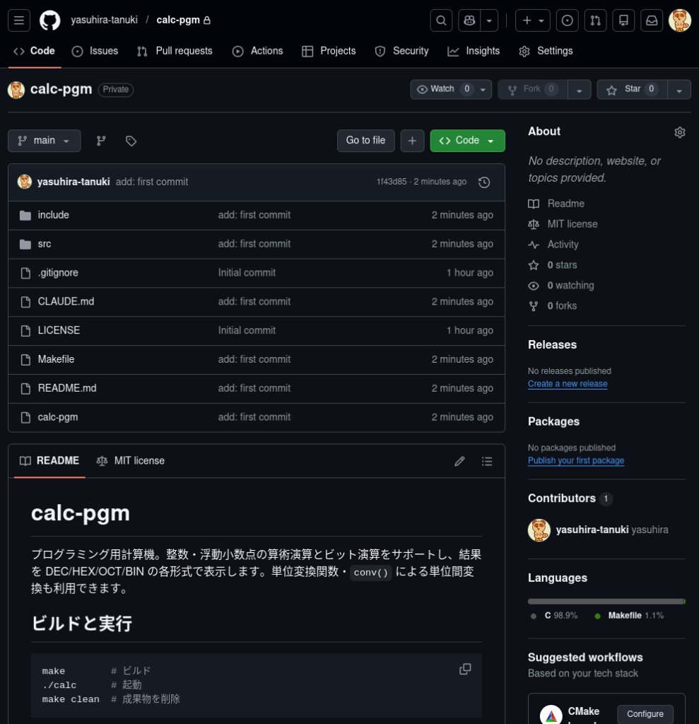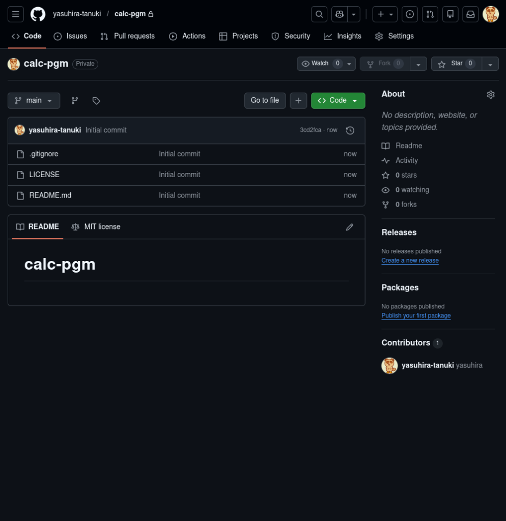 $ git remote add origin https://github.com/yasuhira-tanuki/calc-pgm.gitmainブランチを作成